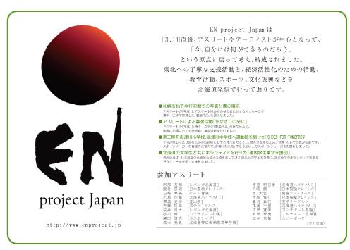 曽田 雄志 1978年北海道札幌市生れ。 元コンサドーレ札幌の選手。 札幌南高校卒業後、一般入試で筑波大学に進学。 大学を卒業した2001年にコンサドーレ札幌に入団。9年間に渡り一貫して同クラブに在籍し「ミスターコンサドーレ」の愛称で親しまれ、中心選手として活躍。 2009年現役を引退。 2010年にコンサドーレ札幌のアドバイザリースタッフに就任。 2011年に「ENプロジェクト」を立ち上げ、東日本大震災の支援活動と、経済活性化のための活動、教育活動、スポーツ、文化振興などを北海道発信で行っている。